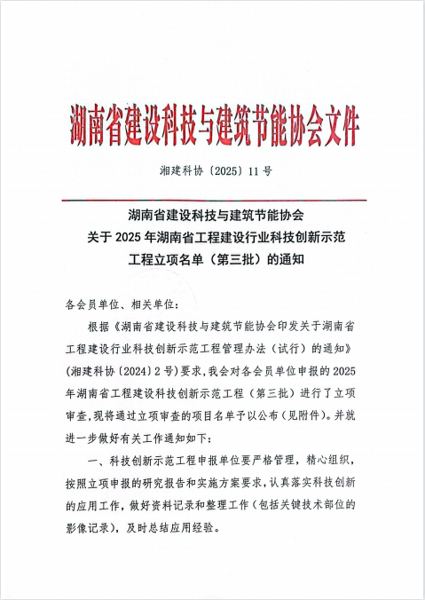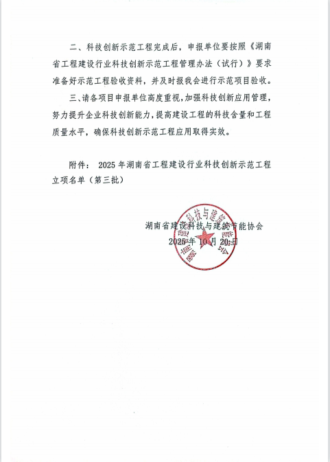 湘建科协〔2025〕11号 各会员单位、相关单位: 根据《湖南省建设科技与建筑节能协会印发关于湖南省工程建设行业科技创新示范工程管理办法(试行)的通知》(湘建科协〔2024〕2号)要求,我会对各会员单位申报的2025年湖南省工程建设科技创新示范工程(第三批)进行了立项审查,现将通过立项审查的项目名单予以公布(见附件)。并就进一步做好有关工作通知如下: 一、科技创新示范工程申报单位要严格管理,精心组织,按照立项申报的研究报告和实施方案要求,认真落实科技创新的应用工作,做好资料记录和整理工作(包括关键技术部位的影像记录),及时总结应用经验。 二、科技创新示范工程完成后,申报单位要按照《湖南省工程建设行业科技创新示范工程管理办法(试行)》要求准备好示范工程验收资料,并及时报我会进行示范项目验收。 三、请各项目申报单位高度重视,加强科技创新应用管理,努力提升企业科技创新能力,提高建设工程的科技含量和工程质量水平,确保科技创新示范工程应用取得实效。