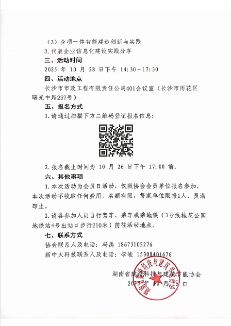 各会员单位: 为顺应工程建设行业高质量发展的新形势、新要求,引导企业以科学管理为核心、降本增效为目标,实现精细化运营升级,我会定于10月28日在长沙组织开展“降本增效 数字转型”主题会员日活动,具体活动安排如下: 一、组织单位 主办单位:湖南省建设科技与建筑节能协会 承办单位:长沙市市政工程有限责任公司 杭州新中大科技股份有限公司 二、活动内容 1.《数字化技术赋能建企高质量发展》内容分析 (1)行业发展现状及管理痛难点剖析 (2)建企管理发展六大能力 (3)数字化技术赋能新型竞争力 2.《企项融合赋能企业成本领先》内容讲解 (1)企项融合打通全过程成本管理 (2)数字化技术帮助企业算准成本 (3)企项一体智能建造创新与实践 3.代表企业信息化建设实践分享 三、活动时间 2025 年 10 月 28 日下午 14:30~17:30 四、活动地点 长沙市市政工程有限责任公司401会议室(长沙市雨花区曙光中路297号) 五、报名方式 1.请通过扫描下方二维码登记报名信息: